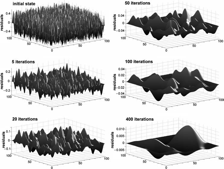 下图反映了一个2D泊松方程的迭代求解过程中残差分布的变化(初始随机分布),模型分辨率为100 × 100个网格点,使用的迭代方法为高斯-赛德尔迭代法。可以发现,长波长(低频)残差的衰减速度要比短波长(高频)残差慢得多。