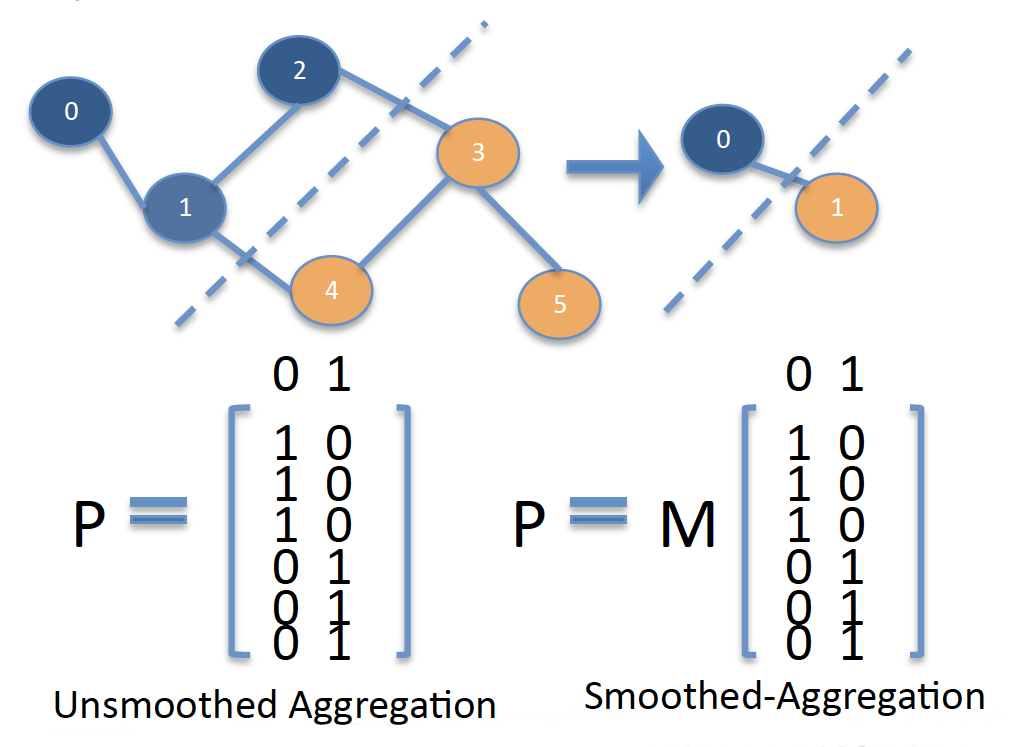 下图为聚合型AMG生成粗矩阵(用图(Graph)表示)的过程,细层0、1、2节点聚合形成粗层0节点,细层3、4、5节点聚合形成1节点,SA和UA两种AMG形成的延拓矩阵P如图所示,延拓矩阵每列反映了每个粗层节点(聚合体)与相应细层节点的包含关系。