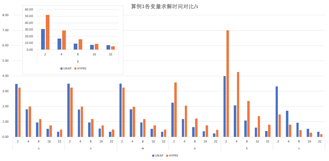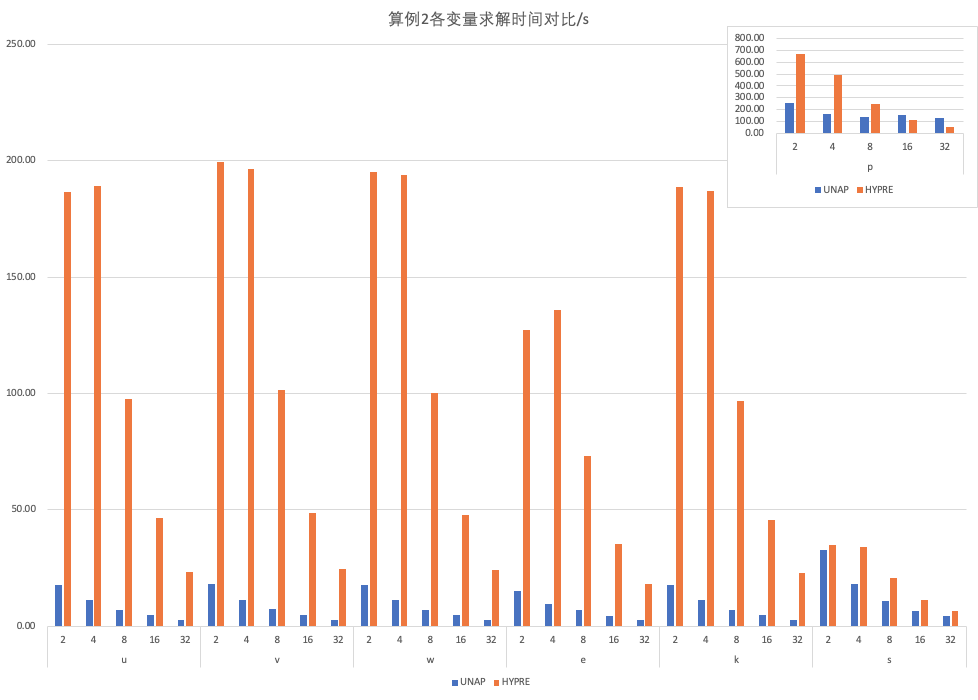 ① 对于 u、v、w、e、k 等变量的求解,经典型 AMG 方法的求解耗时异常地长,尽管其迭代步数显示正常,具体原因尚需进一步分析。