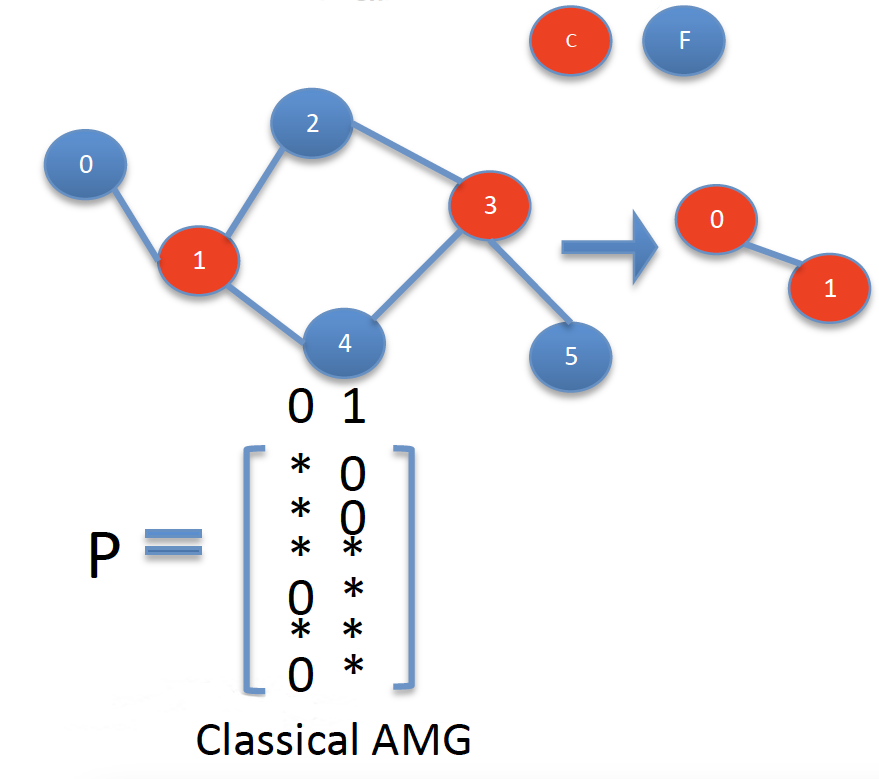 下图为经典型AMG生成粗矩阵(用图(Graph)表示)的过程,从细层中挑选出一些节点作为粗层节点(Coarse Points),其相邻的节点为细层节点(Fine Points),延拓矩阵每列反映了C-points和F-points间的插值关系。