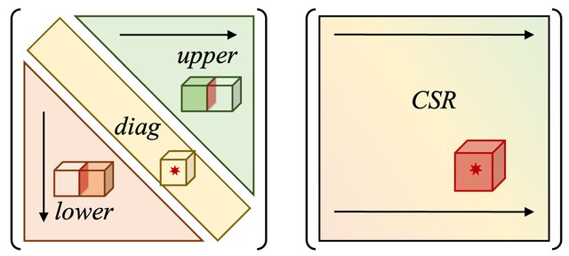 UNAP中的矩阵数据结构包含CSR与LDU两种(结构示意图如下),均为分布式,包含多种矩阵构造接口,这里以CSR构造为例: