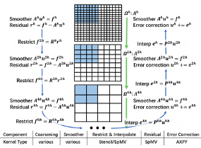 - 求解过程(Solve):通过V/W/F等循环(Cycle)在层次间迭代,直到收敛。