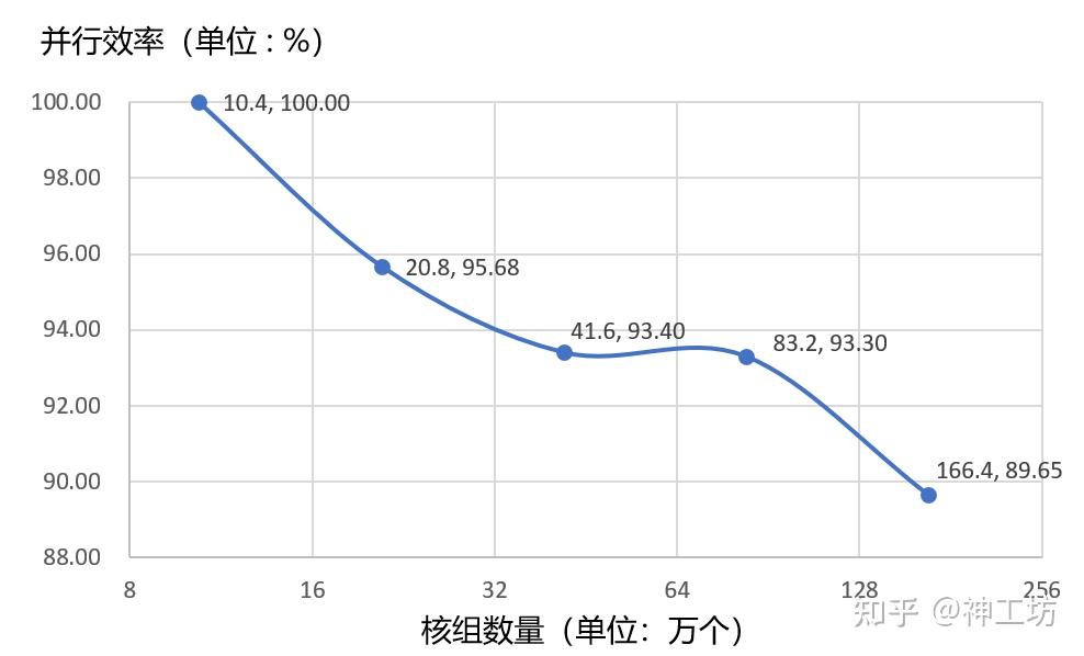 由测试结果可以看出,随着核心数的增加,并行效率出现了下降,百万核心相较于十万核心的并行效率为89.65%,符合预期。